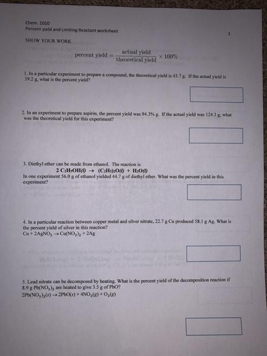 % yield = actual yield_ x 100. About this quiz & worksheet. If my actual yield was 4.5 grams, what was my percent yield? The questions will present you with chemical reactions. If the reaction actually yields 4.5 grams, what was the percent yield? Click on the link below to access the worksheet. "slaked lime," ca(oh)2, is produced when water reacts with "quick lime," cao. The quiz is an array of math problems about percent yield. 2 nacl + cao → cacl2 + nazo. Write a balanced equation for the reaction of tin (iv) phosphate with sodium carbonate to make tin (iv) carbonate and sodium phosphate. A power point presentation to show pupils step by step how to tackle reacting masses questions worksheet to follow. Percent yield of this reaction? Percent yield show all work!!!!!